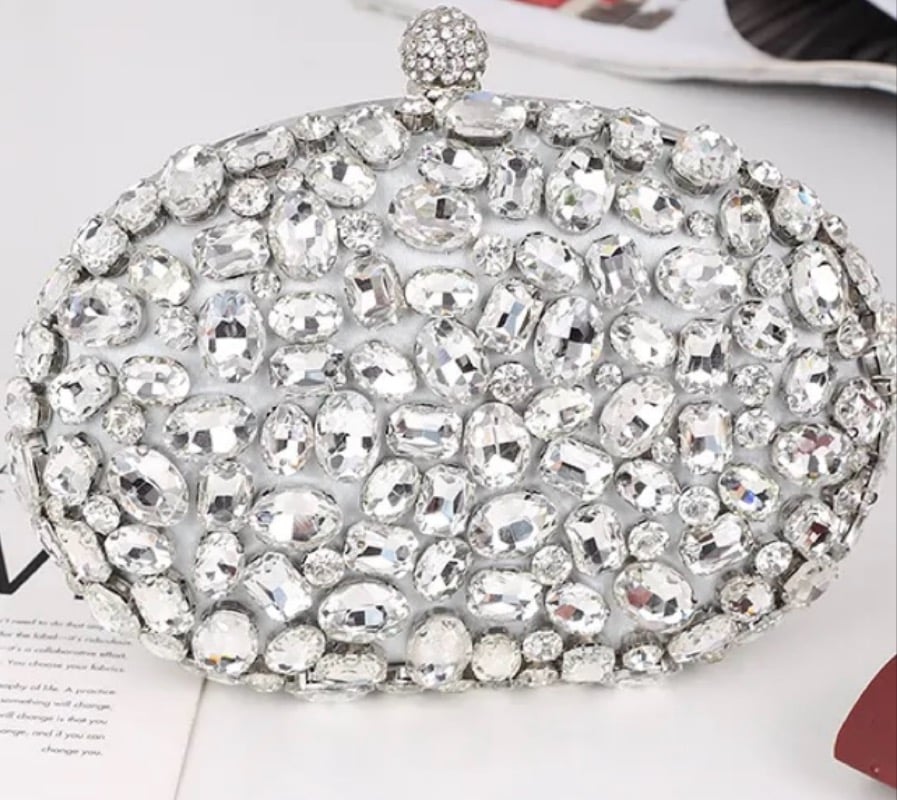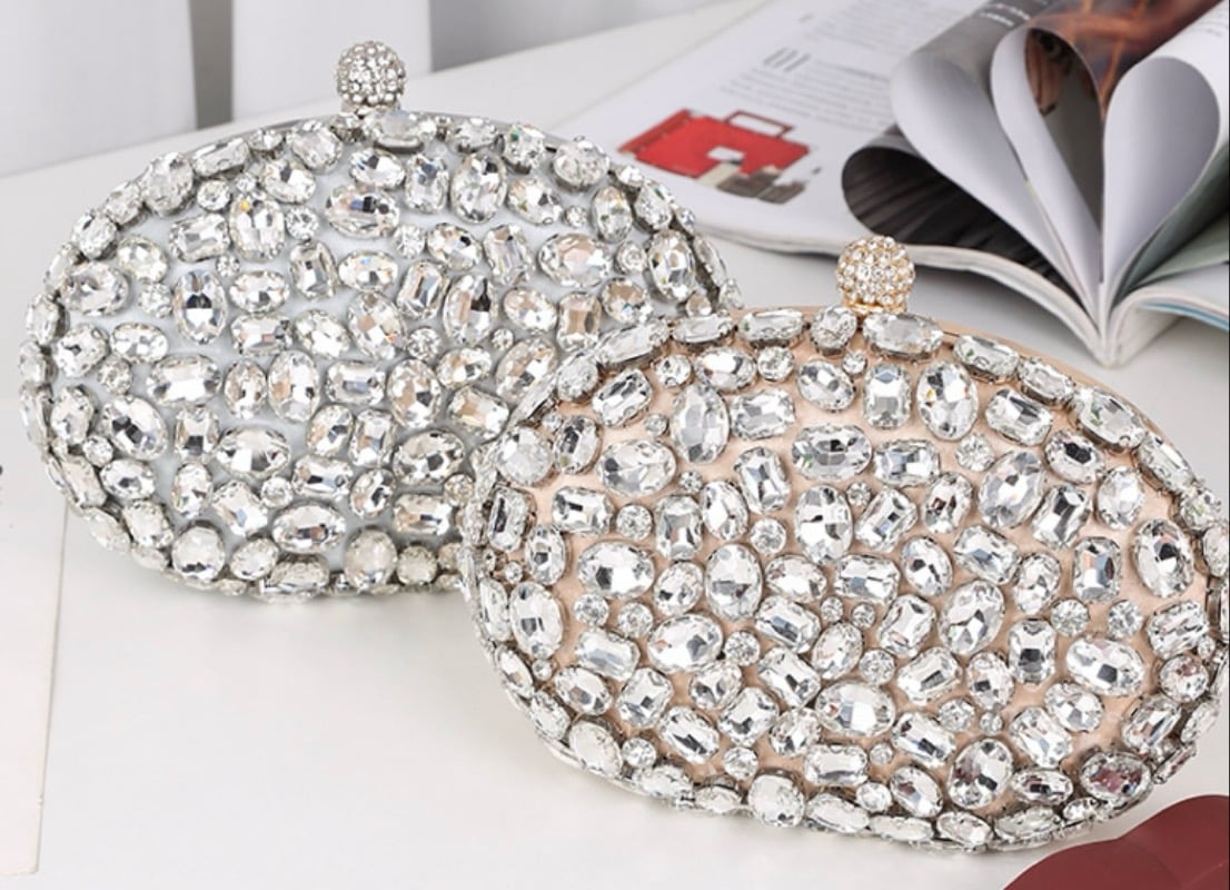 An oval evening bag with a gold or silver rhinestone design can indeed add a touch of glamour to various occasions. Here are some details about the bag: